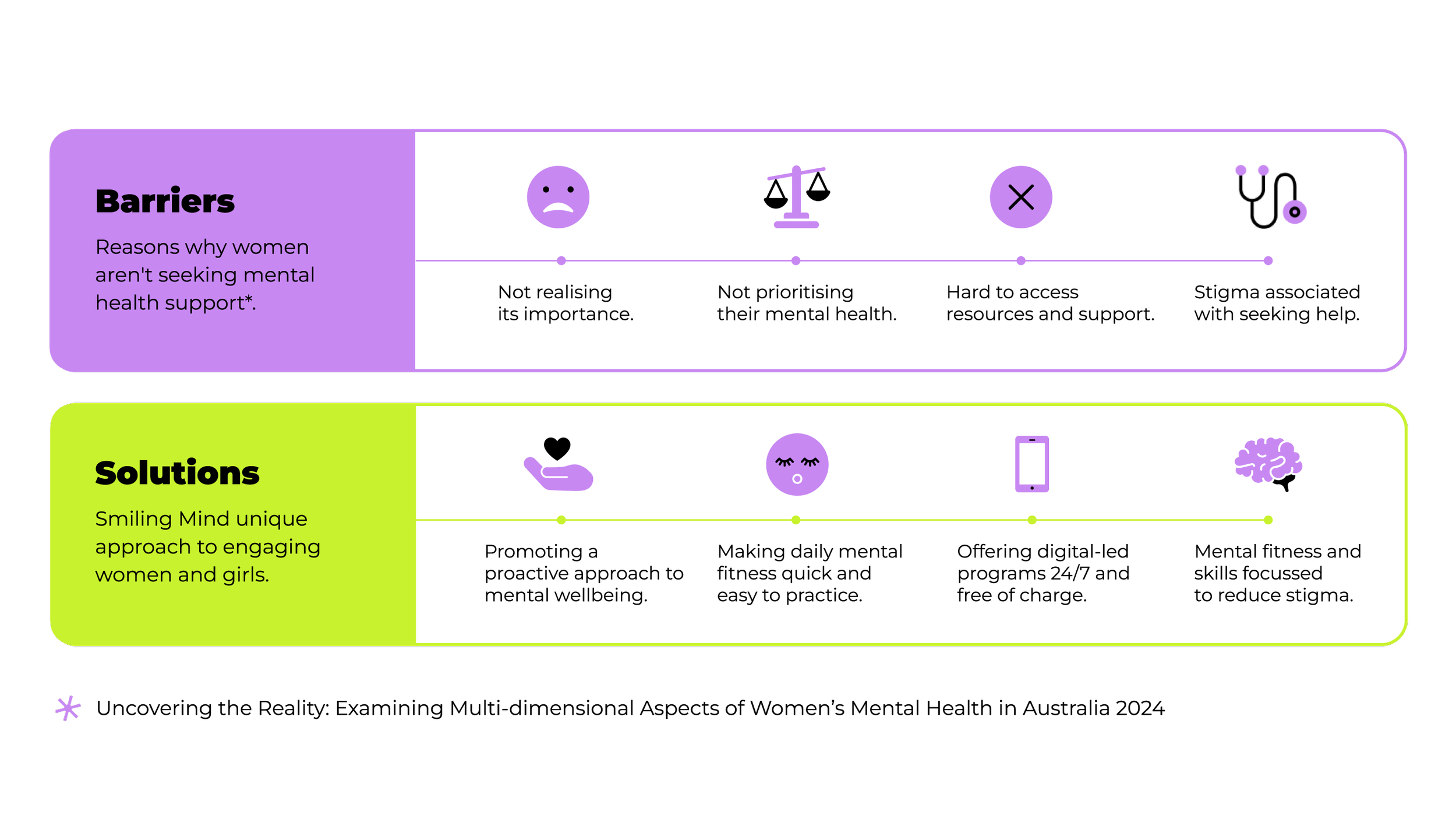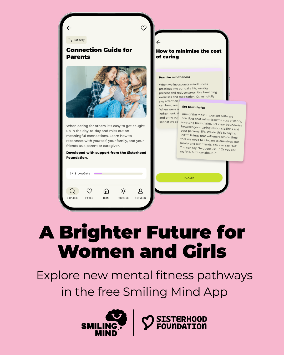 The latest research shows women carry a disproportionate share of unpaid caregiving work²—a load that’s significantly affecting their mental and physical health. Smiling Mind’s 2024 State of Mind Report found that 85% of parents and caregivers are experiencing signs of stress, anxiety, depression, or other mental health challenges. Nearly three in four (72%) feel overwhelmed every week, and 1 in 4 feel overwhelmed every single day.